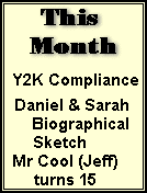 Well right now it seems the Y2K crisis is mostly over. As I was setting here working up the news, I was listneing to the radio, and reports coming in from most of the east coast were good, and no major problems. My (and Rita's) Computers rolled over to the new millenium without a hitch. And since this IS JANUARY FIRST, I guess I will show one more picture!! Mr Cool Has a Birthday!! Jeff told me when I took this pix, that this was his "Mr Cool" pose... What ya all think?? ![]() | ![]() PROPOSED - AUGUST 2001 Stafford, VA.