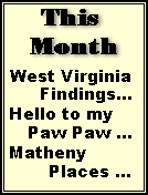 From the reunion, I have gotten more and more emails, and new people who have heard about it. All wanting to join the group. But I have noticed something else. A real Renewed Interest by some of the current members. A very good example of this come as this months Feature Story. With all the number of "Metheny-Matheny" people living right here near the center of it all, I wondered why there wasn't more effort to uncover some of the local Stones... Well apparently Bob and Mary Metheny of Woodbridge, VA. got bitten (or a bigger bite)... Early last Month, after the renunion, they took a weekend trip to the Preston County (Pleasant Hill and Beech Run Districts) in West Virginia. They were seeking to find the burial place for our Ensign Jame Matheny (or might have been Metheny).. Pictured here is the Headstone of Asa Metheny, at the Cress Cemetary. Not only this one, but they uncovered a cemetary that has long since been forgotten, grown over, and almost inaccessable. But what they found there is of interest to all of the family. For the REST of the STORY, CLICK HERE! | |
